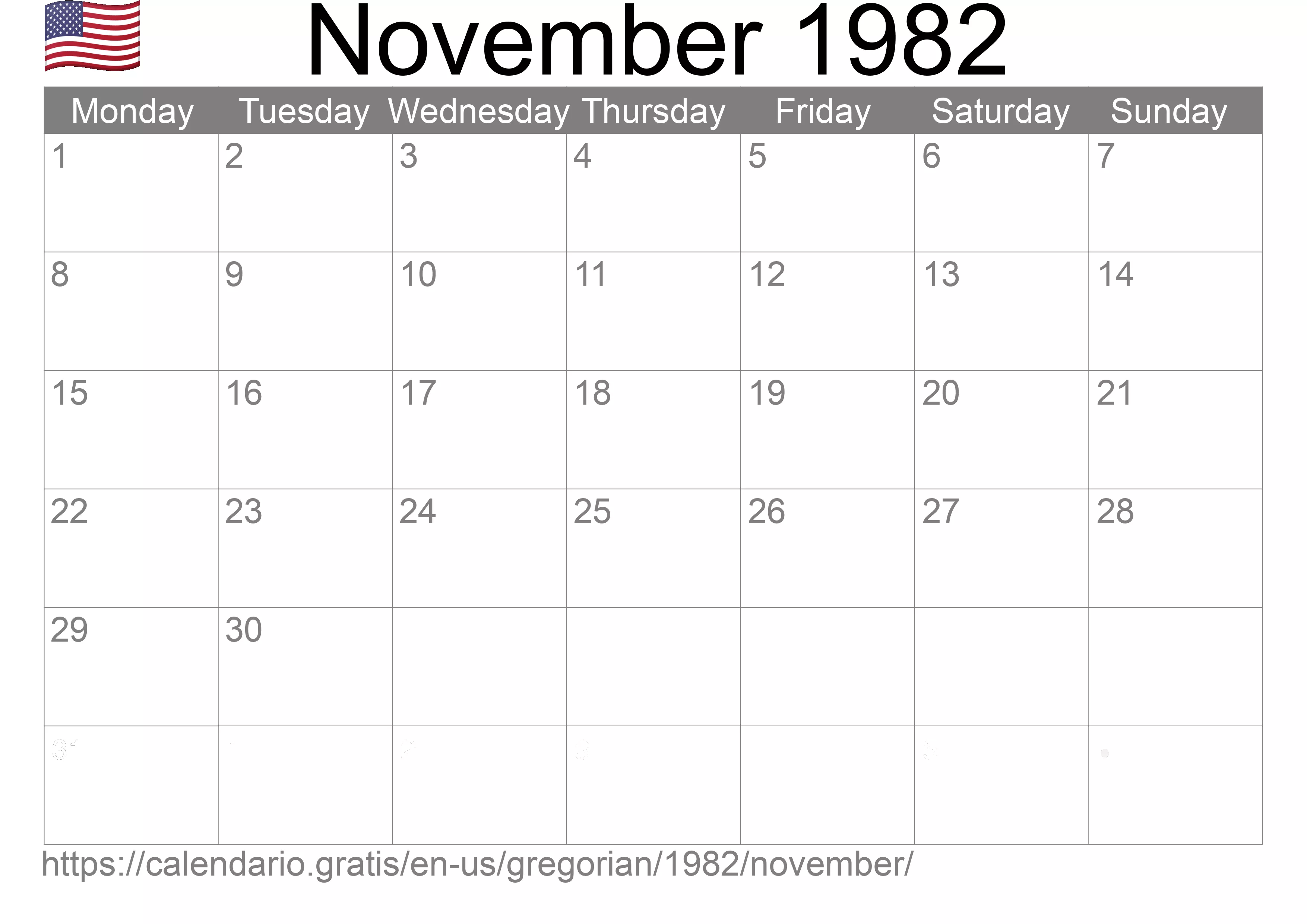 Calendar November 1982 from United States of America in English ☑️